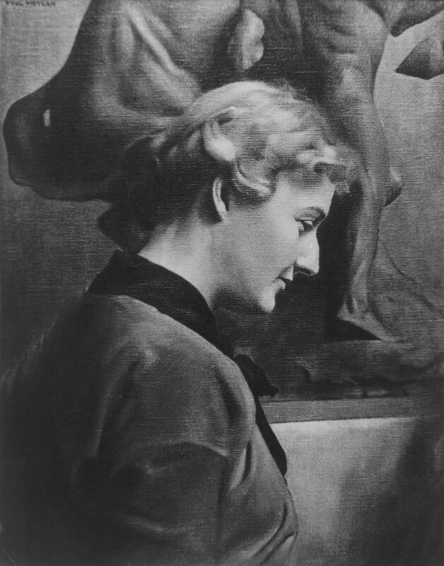 - Black & white photograph of Anna Hyatt Huntington in profile with the detail of a sculpture in the background.