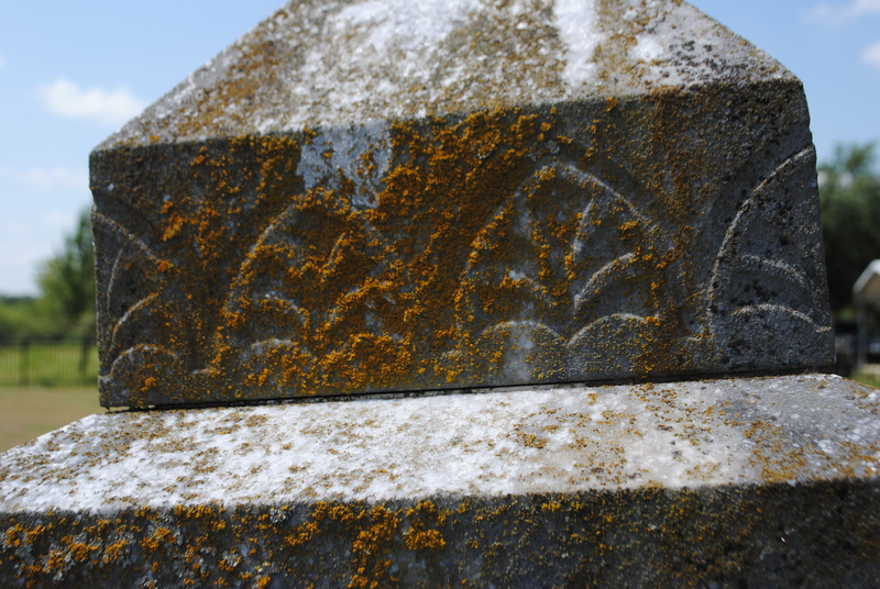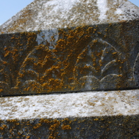 - Close-up detail of a gravestone showing lichens growing on top of botanical carvings in th stone.