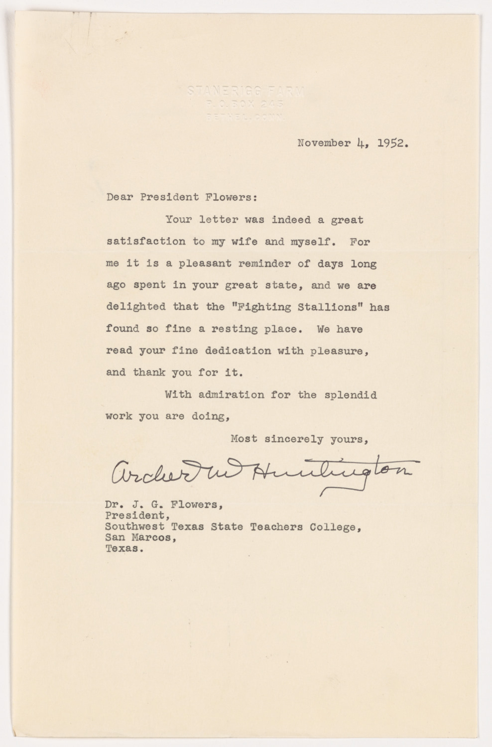 - Letter from Archer M. Huntington to Dr. J.G. Flowers, November 4, 1952
